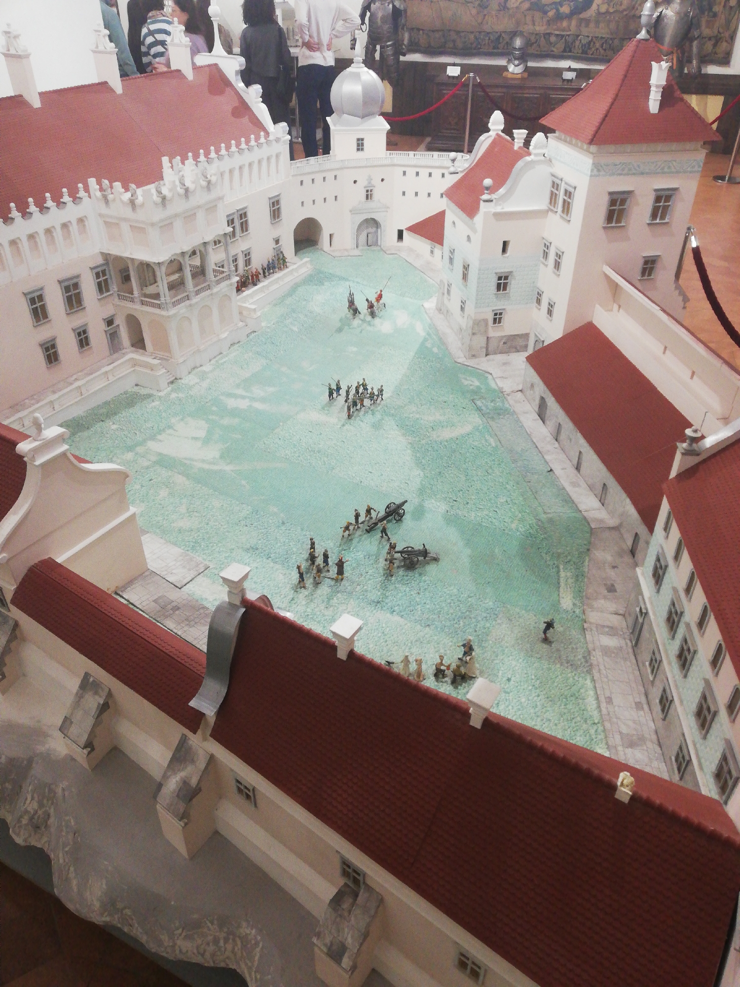 An elevated photograph captures a detailed architectural scale model of Mir Castle, situated in Мірскі сельскі Савет, Belarus, presented indoors within a museum environment. The model consists of multiple light-toned buildings featuring prominent red tile roofs, a central gateway with an arched entrance, and various towers, including one topped with a silver dome. The central courtyard, depicted with a textured, light-teal surface, hosts numerous miniature figures arranged in a historical battle formation. These figures comprise groups of infantry, cavalry, and artillery pieces (cannons), scattered across the courtyard simulating combat. Several partially visible adult spectators are positioned in the background, observing the exhibit. The surrounding environment includes dark wood display elements, a patterned tapestry on a wall, and red velvet rope barriers.