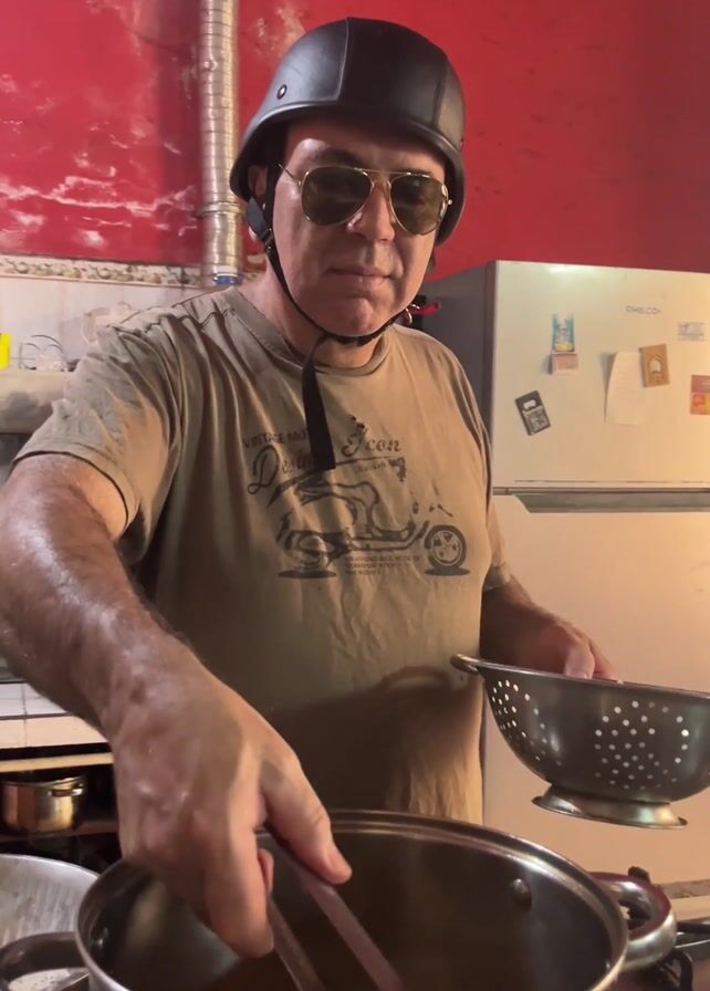 A middle-aged man wearing a helmet and sunglasses is standing in a kitchen, frying food