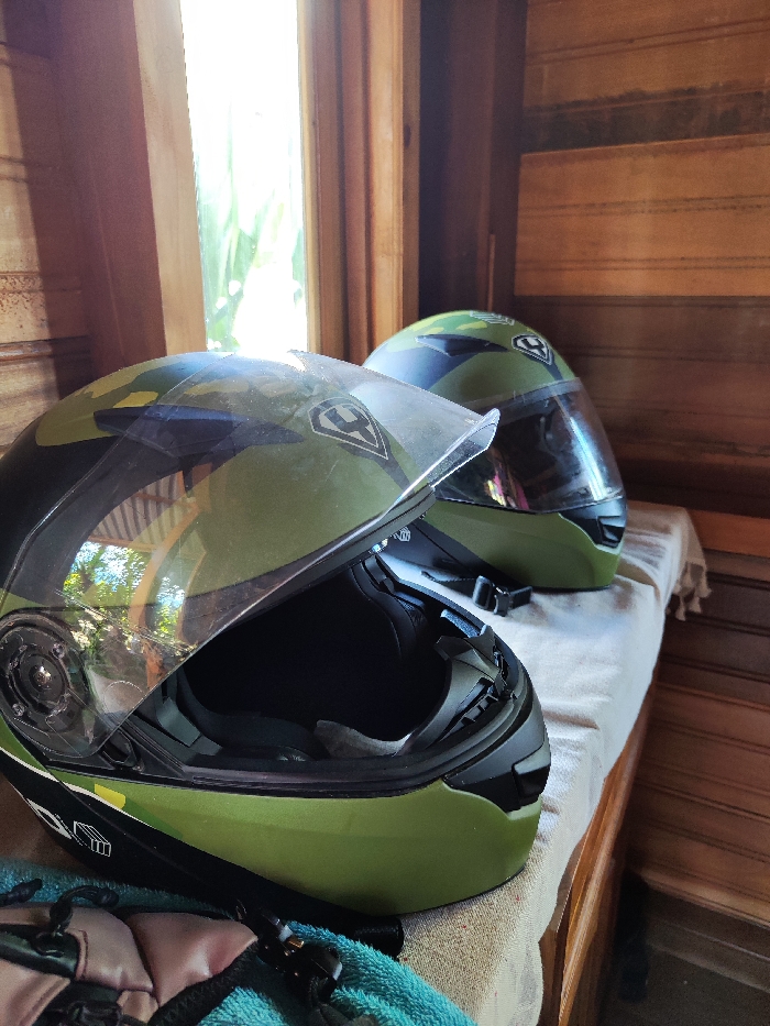 - "This image captures an indoor scene in Lán Tranh, Vietnam, depicting two full-face motorcycle helmets placed on a fabric-covered surface" by FM-WroXJ3, licensed under CC BY 4.0