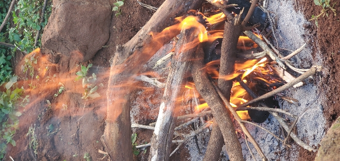 An outdoor fire is depicted in Kitonyoni, Kenya