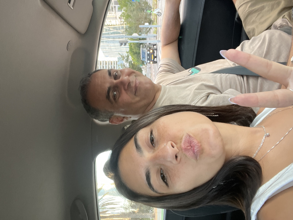 The image depicts a selfie taken from inside a vehicle, featuring two individuals with an urban street scene visible through the windows. In the foreground, a young adult female with long, dark hair, wearing a white tank top and a silver layered necklace, is positioned in the passenger seat. She is holding the camera, forming a "kissy" face with pursed lips, and displaying a peace sign (V-sign) with her right hand. A small nose piercing is visible on her right nostril, and her fingernails are manicured with white tips. Behind her and to the right, an adult male with short, dark, greying hair and a light complexion is seated in the driver's position. He wears a light tan t-shirt with a small graphic design and a visible seatbelt across his chest. He is smiling and looking towards the camera. Through the vehicle's windows, an urban street environment is visible. On the left side of the frame, several palm trees are illuminated, suggesting natural light. In the background, a cluster of modern high-rise buildings with glass facades is prominent, indicative of a city skyline. A multi-lane road is discernible, featuring a dark-colored SUV or Jeep in motion and clear white road markings. To the right, a traffic light pole with functional signals is present, alongside a parked lime-green electric scooter on the sidewalk. This environment, characterized by modern high-rises, palm trees, and urban infrastructure, is consistent with a location within Tel Aviv, Israel, likely along a major road or near the coastal areas where such development is prevalent.