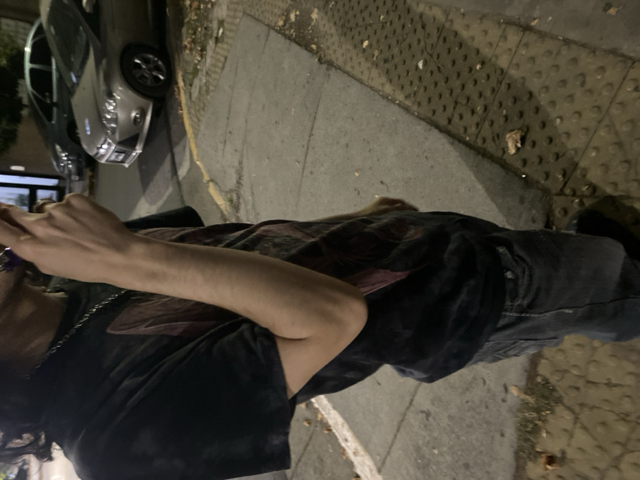 A person stands on a sidewalk next to a car. The individual wears a black t-shirt with a dark design and faded jeans. They are holding something to their face near their mouth, possibly a phone or cigarette. The sidewalk has a textured surface, and leaves are scattered on the ground near the edge. A silver car is parked on the street next to the sidewalk. The scene is illuminated by streetlights, creating a nighttime atmosphere.