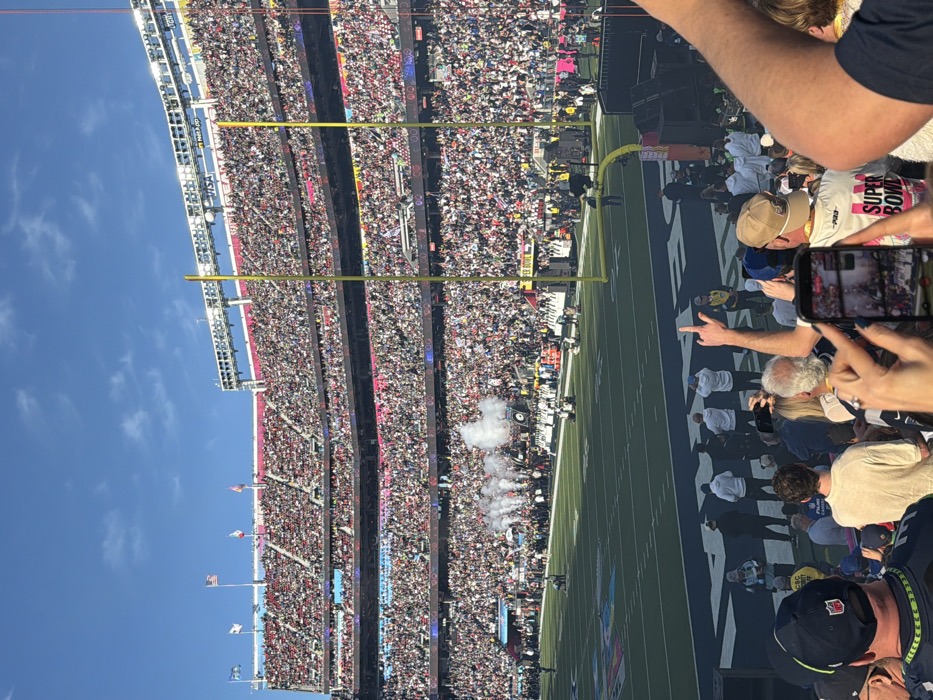 A football stadium packed with spectators during a game, featuring goalposts and field markings. Smoke billows on the field. Foreground elements include onlookers, some holding phones to capture the event. One spectator wears a "SUPER BOWL" shirt. The scene captures the energy and excitement of a live sporting event.