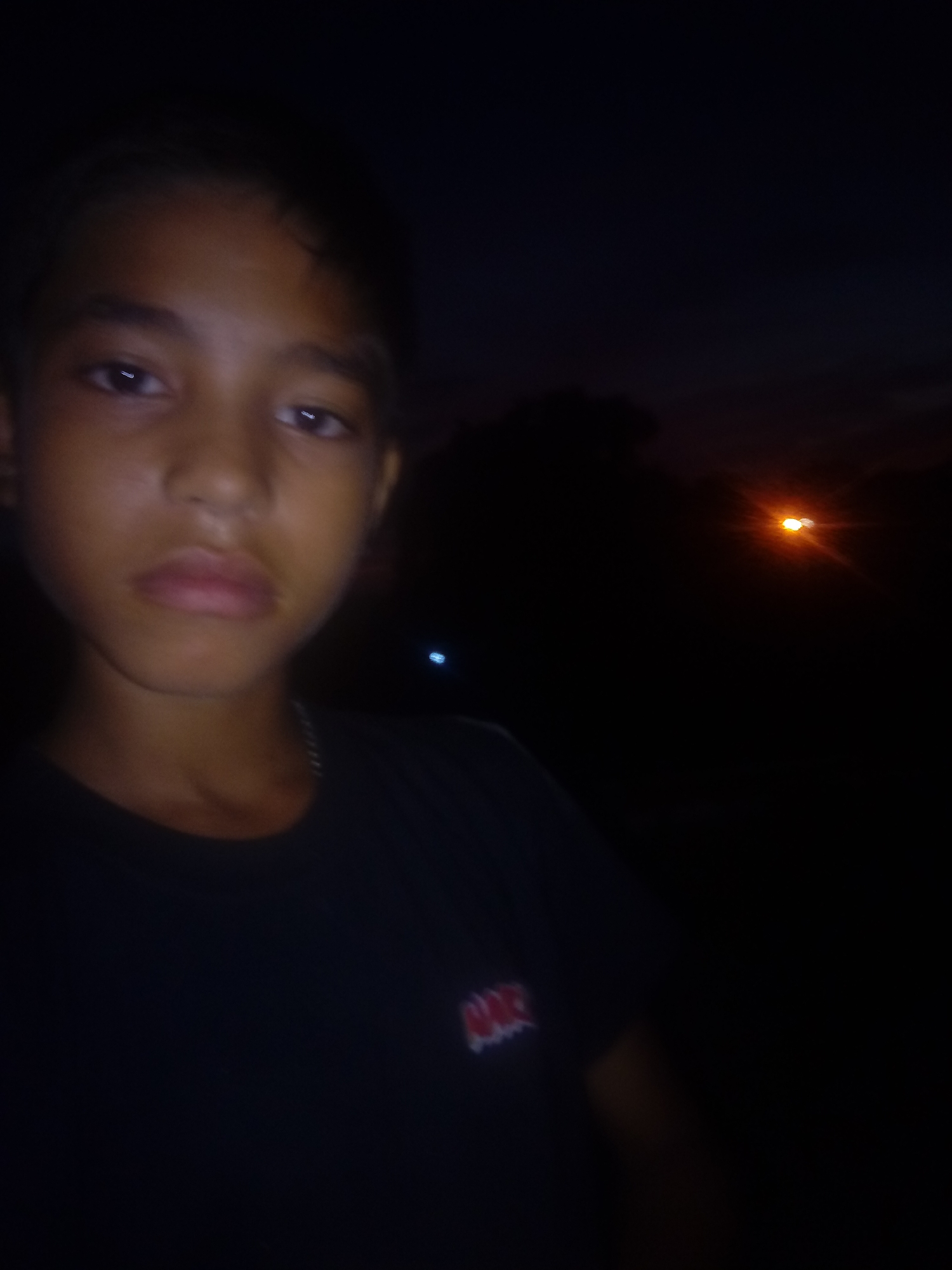 A young person stands in a dark environment, likely at night. A light source illuminates their face and part of their dark-colored shirt with a small, red and white design visible on the chest. A faint light source is visible in the background. The location is Juan Griego, Venezuela.