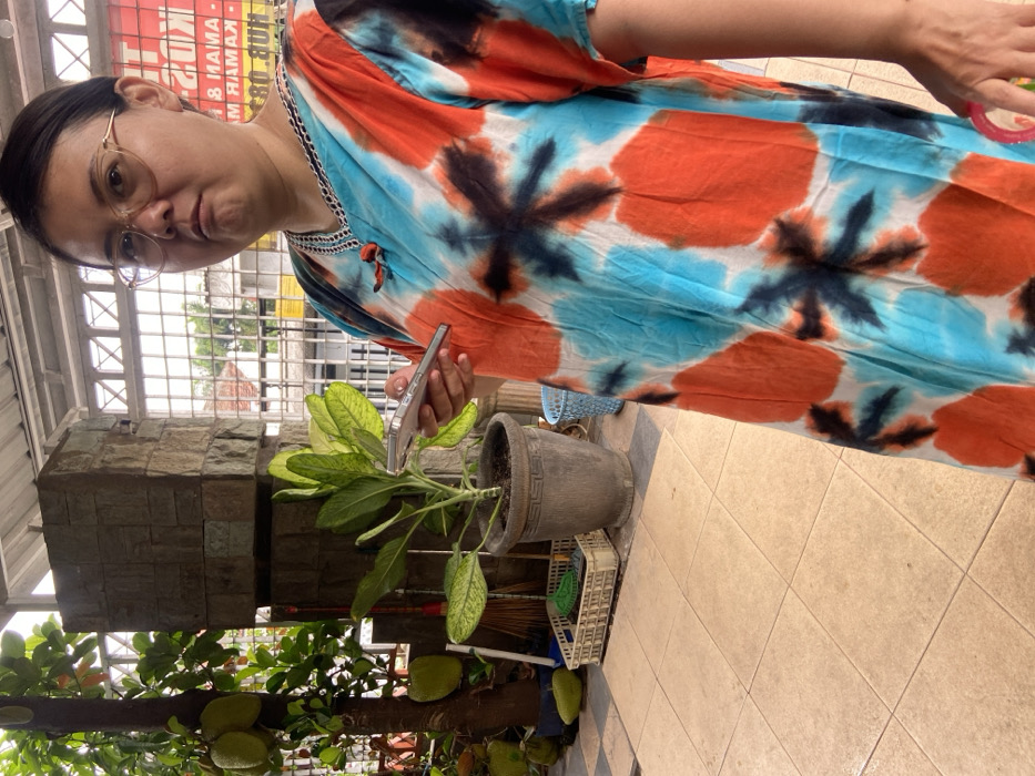 A woman with glasses and dark hair holds a phone near a potted plant. She wears a blue, orange, and white patterned dress. Behind her is a stone structure and a building. Below the plant is a tree bearing large, green jackfruits. The background includes a glimpse of an outdoor tiled area.