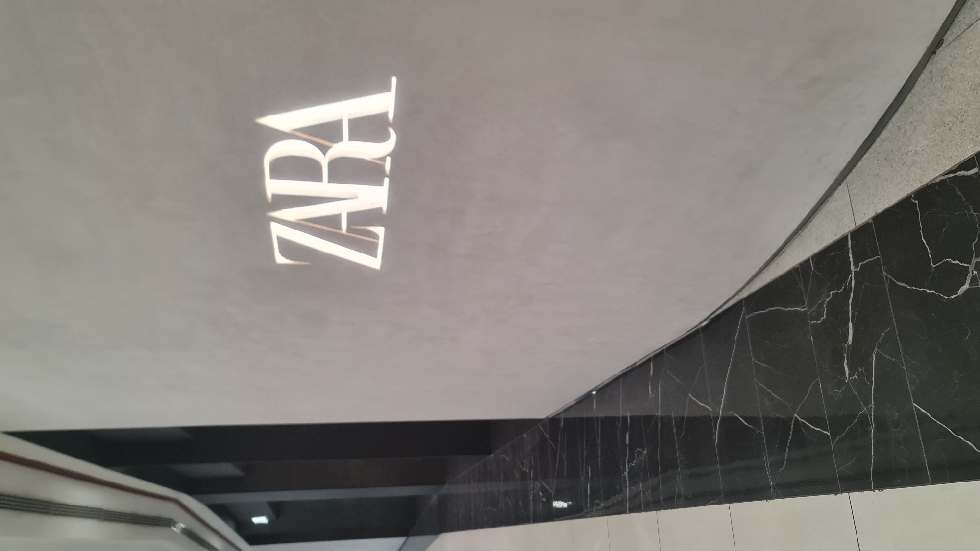 The image depicts an interior perspective of a commercial walkway or corridor leading to a retail establishment within a shopping mall in Sofia, Bulgaria. The illuminated, white sans-serif "ZARA" logo is prominently displayed on a light grey, textured wall on the right side of the frame. The floor consists of distinct tile sections: a central, wide strip of polished black marble with intricate white veining, bordered on the left by plain white tiles and on the right by a narrow strip of light grey aggregate-textured tiles directly beneath the wall. Reflections of overhead artificial lighting are visible on the glossy black marble surface. To the left, a dark-colored, recessed architectural feature, possibly a doorway or passage, is visible. The upper left portion shows part of a white ceiling with horizontal ventilation grilles. No individuals or specific actions are discernible within the scene.