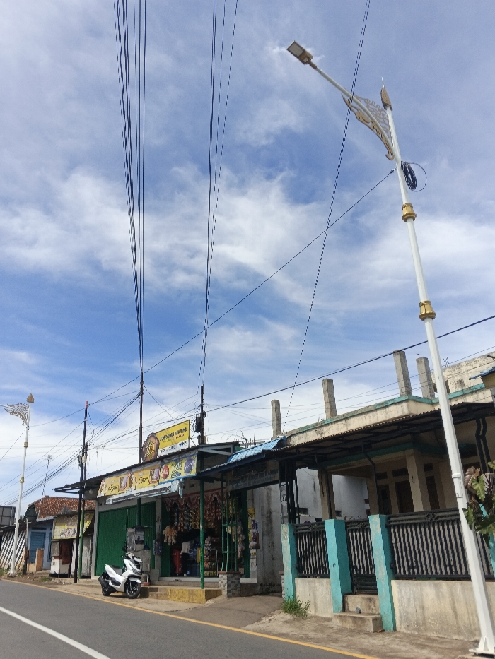 A roadside scene displays a building with shops, one with a green roll-up door and another with hanging goods. A parked white scooter sits in front. Overhead, numerous electrical wires crisscross the sky, and two ornate streetlights stand tall. Partially finished or damaged structures are evident with exposed supports. The sky is blue with scattered white clouds.