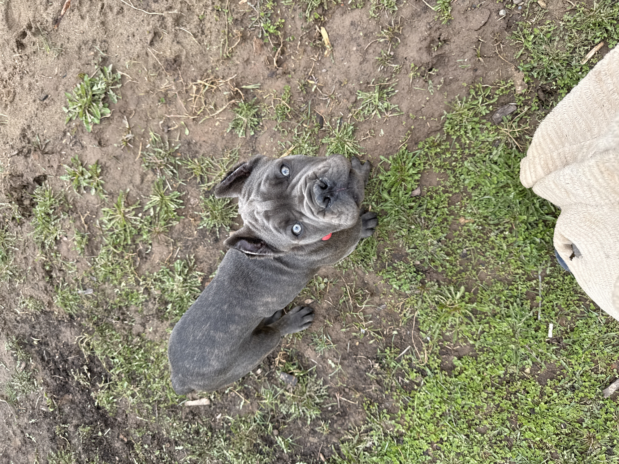 A gray, wrinkly-faced dog with light blue eyes lies on a patch of grass and dirt, looking up toward the camera