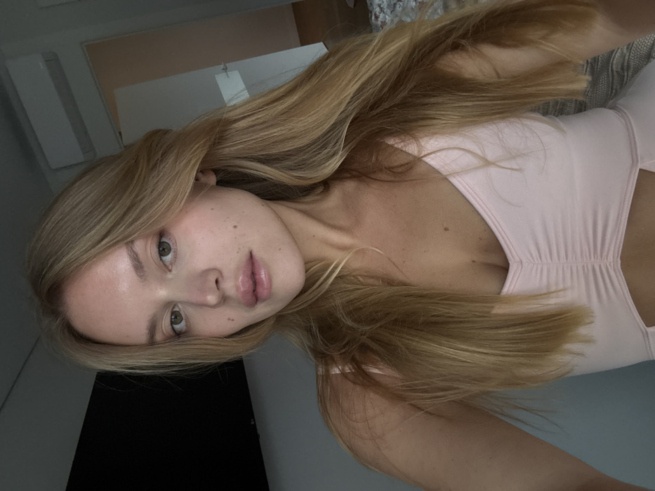 The image depicts a young adult female from the chest up, taking a selfie indoors