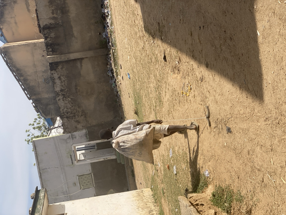 n outdoor scene in Dabawa, Nigeria, under clear, bright daylight. A young male, seen from behind, walks away from the viewer along a dirt path. He wears a light-colored, short-sleeved patterned shirt, light shorts, and dark sandals. A large, full, light-colored sack is carried over his left shoulder. In his right hand, he holds a stick with a string attached to a small, dark, flat object that is being dragged along the ground. To the left of the path, a two-toned light-colored building with a partially open white door is visible, featuring a window with a green frame and text above the door displaying "08037770777" and "07037706663." Sparse tree branches extend above this building. To the right, a tall, textured concrete wall, topped with barbed wire, runs horizontally across the midground. A substantial accumulation of refuse, including plastic bags and various debris, is scattered along the base of this wall. The ground consists of dry, reddish-brown earth with minimal patches of green vegetation and scattered litter. A prominent, dark, triangular shadow from an unseen object extends into the right foreground.