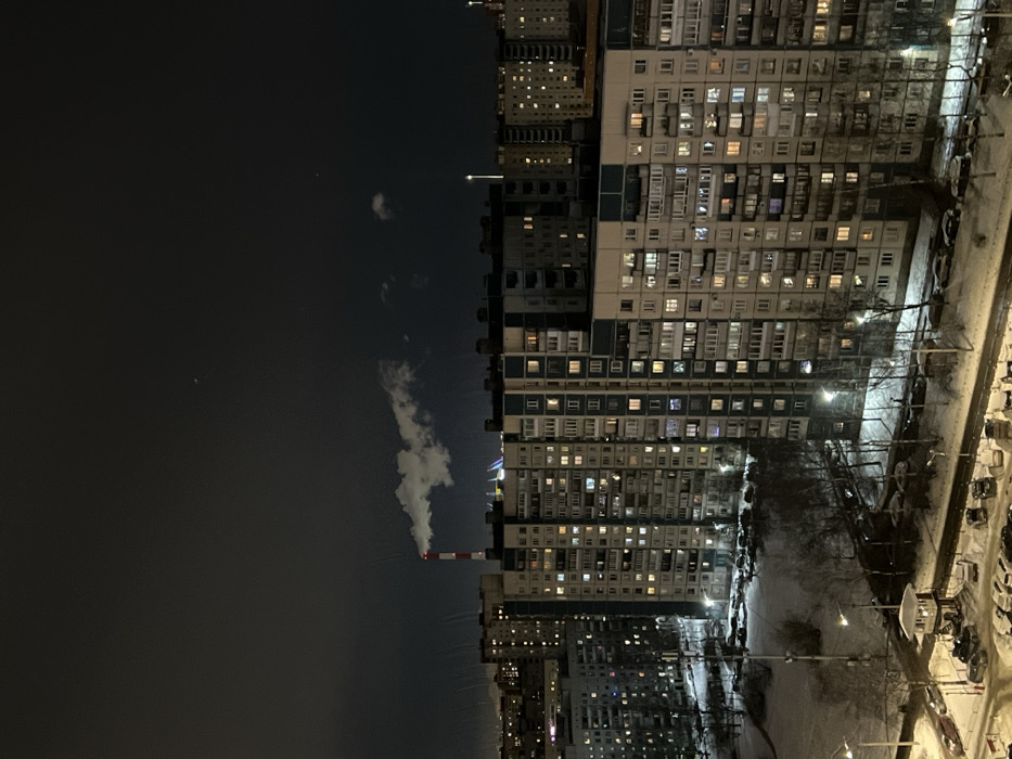 A nighttime view of towering buildings with many illuminated windows, suggesting high-density urban living. A tall chimney emits a stream of white smoke that dissipates into the dark sky. Streetlights illuminate a snowy ground area, where vehicles are parked. The sky is predominantly dark, save for a few wisps of clouds.