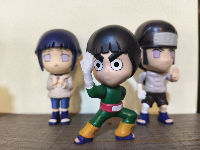 The image displays three anime collectible figures arranged on a textured wooden surface against a plain, light-beige background in an indoor setting. The precise location within the city of Chimbote, Peru, is not identifiable from this image, which features manufactured objects rather than a geographical landmark. In the central foreground, sharply in focus, is a Rock Lee figure, approximately 10-12 cm tall. It is depicted in a green jumpsuit with a red waist sash, white hand wraps, yellow leg wraps, and blue sandals. This figure is posed in a low martial arts stance with its left arm raised and right arm bent at the elbow. It has black bowl-cut hair, thick black eyebrows, and wide, white-rimmed eyes with black pupils. To the left, positioned slightly behind Rock Lee and out of focus, stands a Hinata Hyuga figure. This figure wears a light-colored, possibly fur-trimmed, hooded coat over blue pants and dark blue shoes. It has dark blue bob-cut hair and light purple, pupil-less eyes, indicative of the Byakugan. Its hands are clasped in front. To the right, also slightly behind Rock Lee and out of focus, is a Neji Hyuga figure. This figure wears a grey short-sleeved shirt, dark shorts, white leg wraps on the right leg, and dark blue shoes. It has dark hair tied back under a black headband featuring a grey Konoha village symbol, and light purple, pupil-less eyes, also indicative of the Byakugan. Its right arm is bent with the hand open. The lighting is even and diffuse, originating from the front, casting minimal shadows.