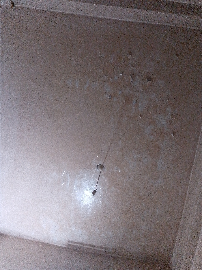 An interior view shows a damaged light beige-brown ceiling in a room located in the city of Unknown, Unknown