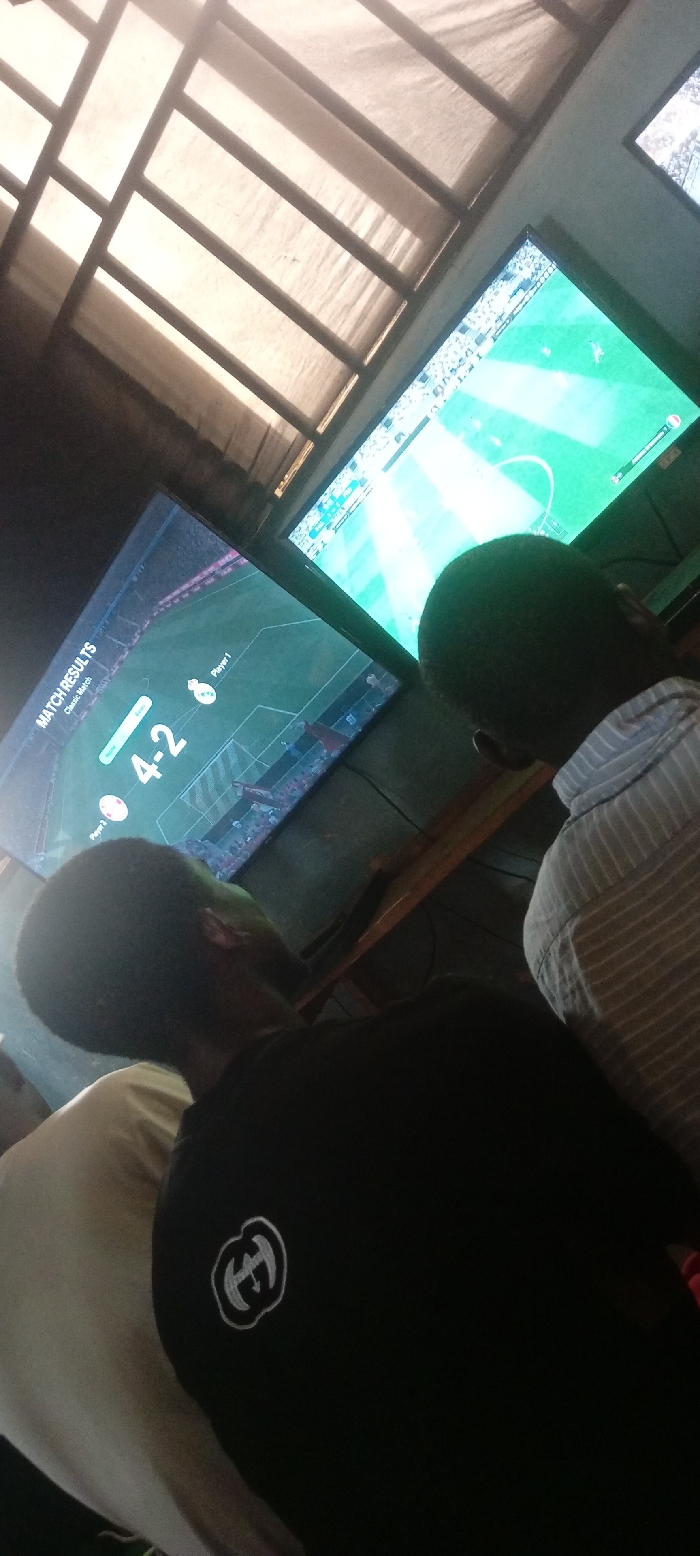 This image depicts an indoor scene located in Ihiagwa, Nigeria. Two individuals are seated with their backs to the camera, facing two large, flat-screen televisions. The individual on the right wears a light-colored striped collared shirt. The individual on the left wears a black t-shirt featuring a white circular logo on the upper left back. Both individuals exhibit short, dark hair. The television on the left displays a "MATCH RESULTS" screen for a "Classic Match" with a score of "4-2," indicating a concluded football (soccer) video game. The television on the right displays an active football video game in progress on a green virtual field. Overhead, a ceiling structure composed of light-colored, possibly translucent panels divided by darker frames provides ambient illumination. A dark shelf or stand is present beneath the televisions.