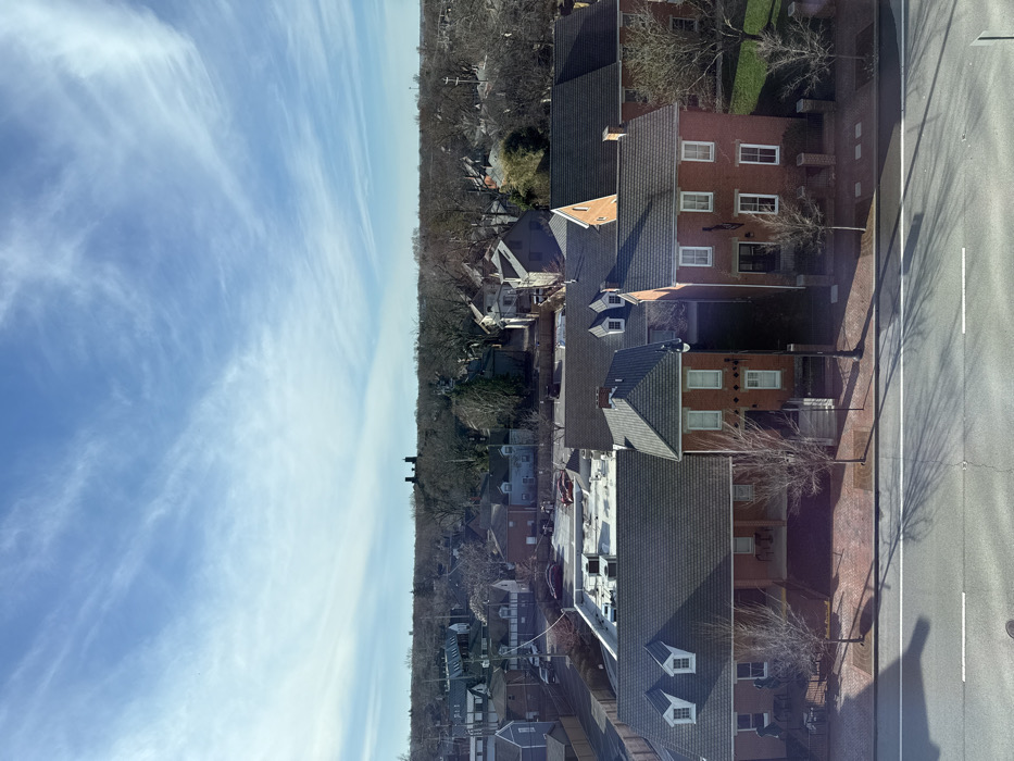 This elevated view captures a detailed cityscape within German Village, Columbus, Ohio, United States of America, under a partly cloudy blue sky. The foreground features a multi-lane asphalt street, identified as Sycamore Street, with a solid white line and a dashed white line. Long, slender shadows from bare trees are cast across the street, extending from the lower-left towards the upper-right. Immediately behind the street is a brick sidewalk. A row of buildings dominates the mid-ground. On the left, a large, two-story brick building with a dark gray gabled roof and three prominent white dormer windows is visible. This building, identified as the Old Mohawk Restaurant & Bar (189 Sycamore Street), features a recessed patio area furnished with outdoor tables and chairs. Within this patio, a dark-colored statue group, likely "The Pretzel Seller," is present. Behind this section of the building, a flat roof with visible HVAC units extends towards the rear, leading to a parking lot containing several parked vehicles, including red and dark-colored sedans. Adjacent to the Old Mohawk, to its right, stands a narrower, two-story brick building with a dark gray gabled roof and white-framed windows. A black street lamp pole is positioned in front of this building. Further to the right, another similar two-story brick building with a dark gray gabled roof and white-framed windows is visible, featuring a dark front door. A small, bare grassy area is situated to its immediate right. Several bare deciduous trees are interspersed along the sidewalk and between the buildings. The background comprises a dense residential and commercial area characterized by various two-story buildings with differing rooflines and colors, alongside numerous bare deciduous trees. On the distant horizon, slightly to the left of the center, two distinct dark, tall, vertical structures, consistent with industrial chimneys or stacks, rise above the tree line. The sky occupies the upper portion of the frame, displaying a clear blue with scattered, wispy white cirrus clouds. The scene is illuminated by bright daylight, indicated by the well-defined shadows. No individuals are clearly discernible.