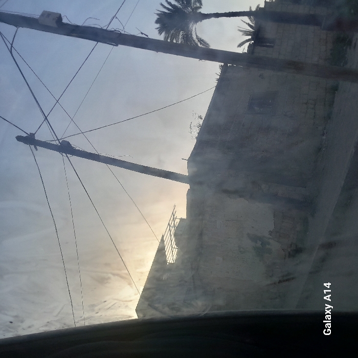 A street scene is captured from within a vehicle. Utility poles with tangled wires dominate the left side, leading up to a cloudy sky. A building stands on the right, appearing weathered with faded paint. A palm tree rises behind the building, adding a tropical element. A metal structure is affixed to the building's side. The image has a slightly distorted view, possibly due to the windshield.