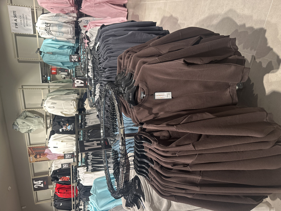 This image depicts the interior of a New Yorker clothing store in Heilbronn, Germany. The scene is an indoor retail space with light grey tiled flooring and light grey walls, equipped with a metal track shelving system. Artificial overhead lighting illuminates the area, casting shadows on the floor. In the foreground, a large circular clothing rack displays numerous plain, dark brown long-sleeved crew-neck sweatshirts, each hanging on a black "NEW YORKER" branded hanger. One sweatshirt exhibits a white rectangular price tag with red text. In the mid-ground and background, additional clothing racks and wall-mounted displays present a variety of garments. These include light blue, grey, white, black, red, and pink hoodies and sweatshirts, some with graphic designs. Pink trousers are visible on a wall display to the right. A light grey zip-up hoodie is displayed on a torso mannequin positioned on a wall shelf. Several black and white price signs are visible, indicating "24," "19," and "14" (presumably in Euros). A white rectangular sign in the upper right corner reads: "I'M A SET! LOOK FOR MY MATCHING BETTER HALF!". A vertical poster on the back wall features a male model wearing a light pink shirt and sunglasses. No individuals are present, and no actions or interactions are depicted in the static scene.