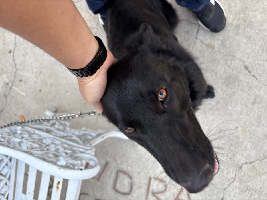 The scene depicts an overhead view of a human interacting with a dog in Chamilpa, Mexico. A human's right arm, wearing a black link-style wristband or watch, is shown petting the head of a black dog. The dog, with amber-brown eyes and a long snout, is looking upwards and slightly to its left; its pink tongue is slightly extended. The dog appears to be on a leash, with a metal chain leash visible extending towards an ornate, white, possibly metal or cast-iron bench structure in the upper left background. The human's left leg, clad in blue jeans and a black sneaker with a white sole, is partially visible in the lower right. The ground is light gray concrete, exhibiting cracks and some faint, out-of-focus red lettering or graffiti. The overall setting appears to be outdoors.