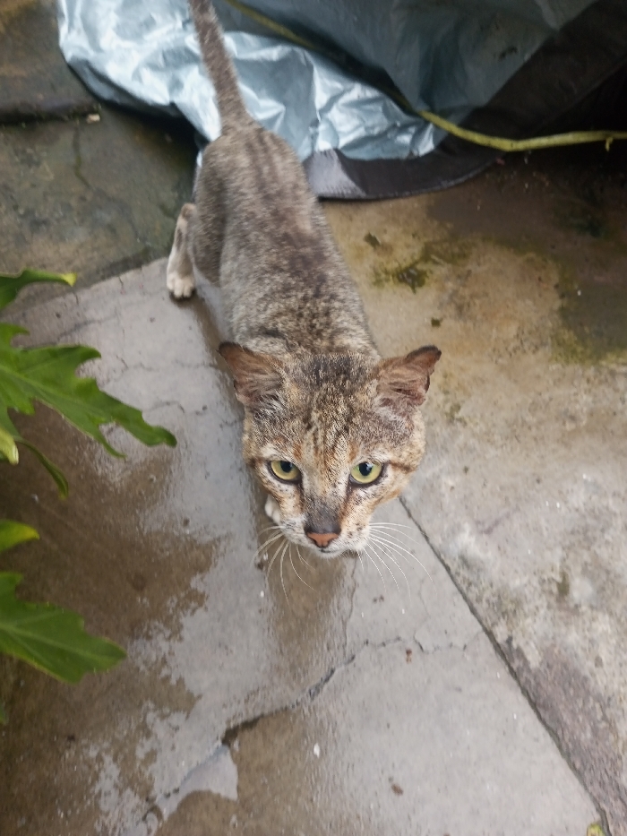 - "In Kotakonda, India, a lean domestic cat, exhibiting mottled brown, black, and tan tabby markings, stands on wet, cracked concrete pavement, looking directly upwards towards the viewer" by FM-OUF5o1, licensed under CC BY 4.0