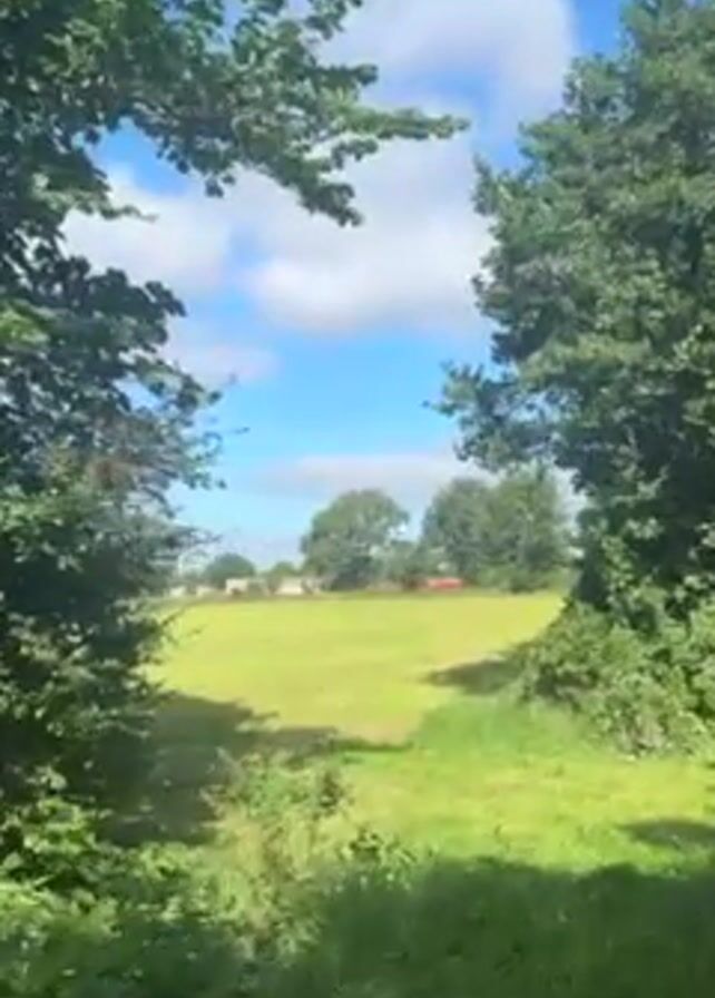 The camera pans from between two trees, revealing a large grassy field surrounded by more trees in the distance under a bright blue sky with fluffy white clouds.