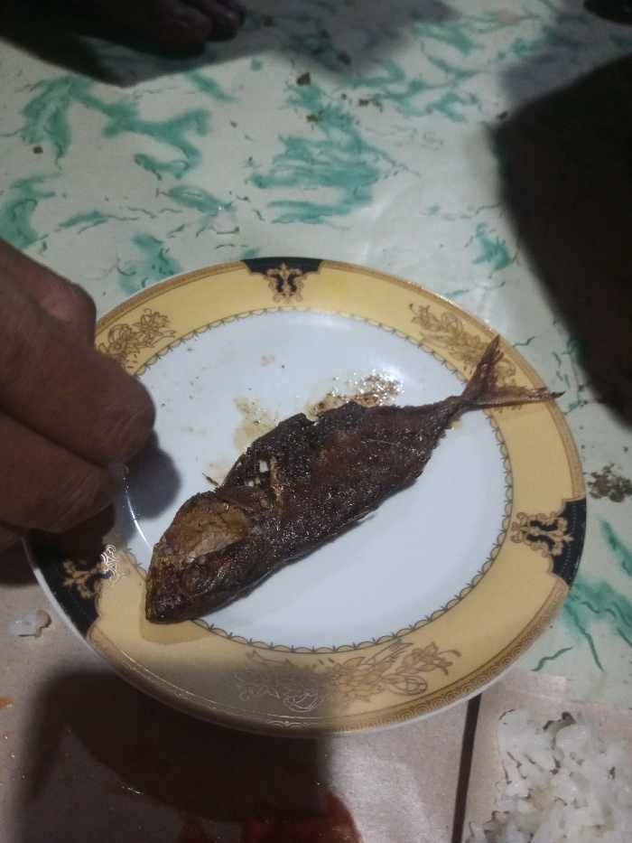 - "A plate contains a grilled fish, dark in color, set against a white surface with a gold and black decorative border" by FM-O0Epn2, licensed under CC BY 4.0