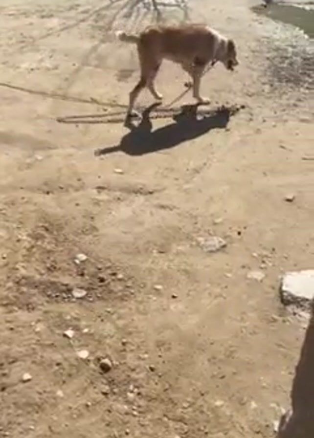 A medium-sized dog, white and tan, is leashed with a heavy chain, walking on a dirt surface