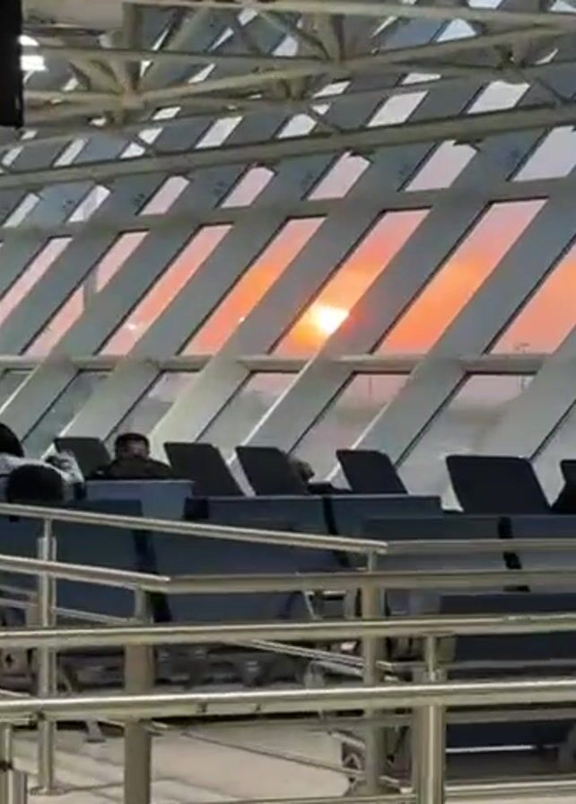 waiting area with blue chairs, possibly in an airport, with people sitting and waiting. The background has large windows with a grid pattern, and a bright orange sunrise or sunset is visible through the windows. The camera is static.