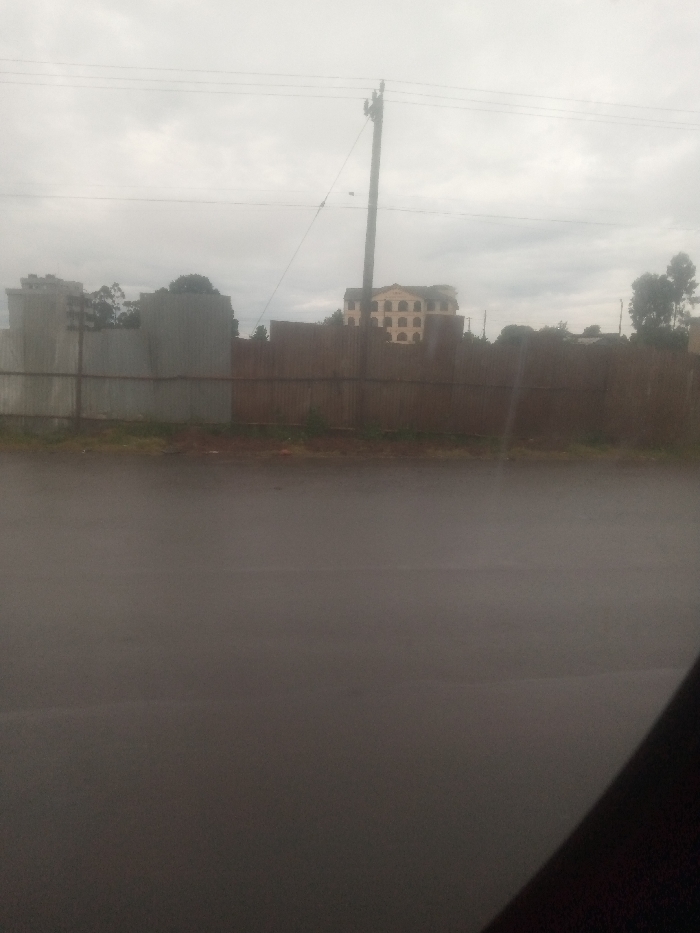 The image captures an outdoor scene in Ngong ward, Kenya, under an overcast sky. The foreground consists of a dark asphalt road surface. A dark, angular obstruction, consistent with an interior vehicle component, is present in the lower right corner. In the midground, a continuous barrier separates the road from the background; this barrier is constructed from corrugated metal sheets, with lighter, possibly galvanized, panels on the left half and rusted, brown panels on the right half. A strip of green vegetation is visible at the base of the barrier. In the background, multiple structures are visible above the barrier. To the left, several grey, unfinished or under-construction structures are partially obscured by dense green foliage. To the right, a distinct multi-story building with a light-colored facade and numerous arched windows is prominently visible. A tall utility pole, equipped with multiple cross-arms and power lines, stands in the mid-right, extending above the background structures into the grey, cloudy sky. No individuals, specific actions, or interactions are observed within the frame.
