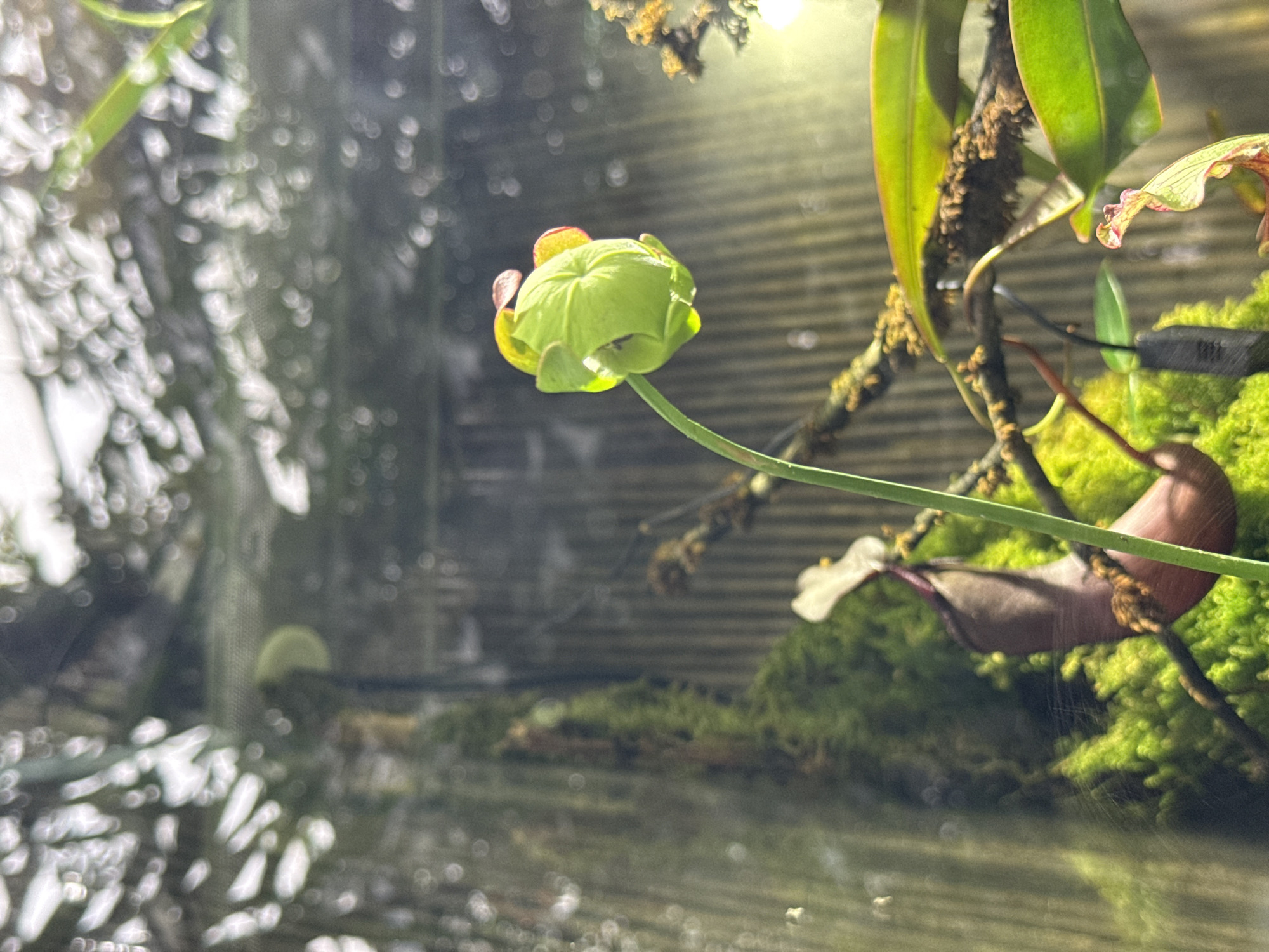This image presents a forensic close-up of various plant species within a controlled horticultural environment, strongly suggesting the Botanical Garden of Ulm University in Ulm, Germany. The primary subject is a distinct, upright, unopened light-green carnivorous plant structure, likely a flower bud or a nascent pitcher of a *Sarracenia* or *Nepenthes* species. It features subtle reddish-pink accents on its upper, folded flaps and is supported by a slender green stalk rising from the lower-left quadrant towards the center-top. In the lower-left segment, a mature, dark reddish-brown *Nepenthes* pitcher plant, complete with a pale, possibly white or cream-colored, lid, is partially visible, emerging from a dense, vibrant green moss substrate. Additional plant matter, including broad green leaves and horizontal branches, is present, with some surfaces covered in the same bright green moss and others displaying clusters of small, brownish, granular organic accretions. A faint, delicate spiderweb is discernible on the far left, spanning between the moss and an indistinct background element. The background elements are largely out of focus, creating a shallow depth of field. Vertical, ribbed panels, suggestive of a greenhouse or conservatory wall construction, are visible behind the vegetation. To the upper-left, a vertical structure heavily covered in dark green moss also contributes to the background. The upper portion of the image is characterized by numerous bright, circular bokeh patterns, indicating sunlight diffusing through a textured glass or polycarbonate roof, possibly with condensation or water droplets. The overall lighting is bright and appears natural. The scene is devoid of human presence or overt actions.