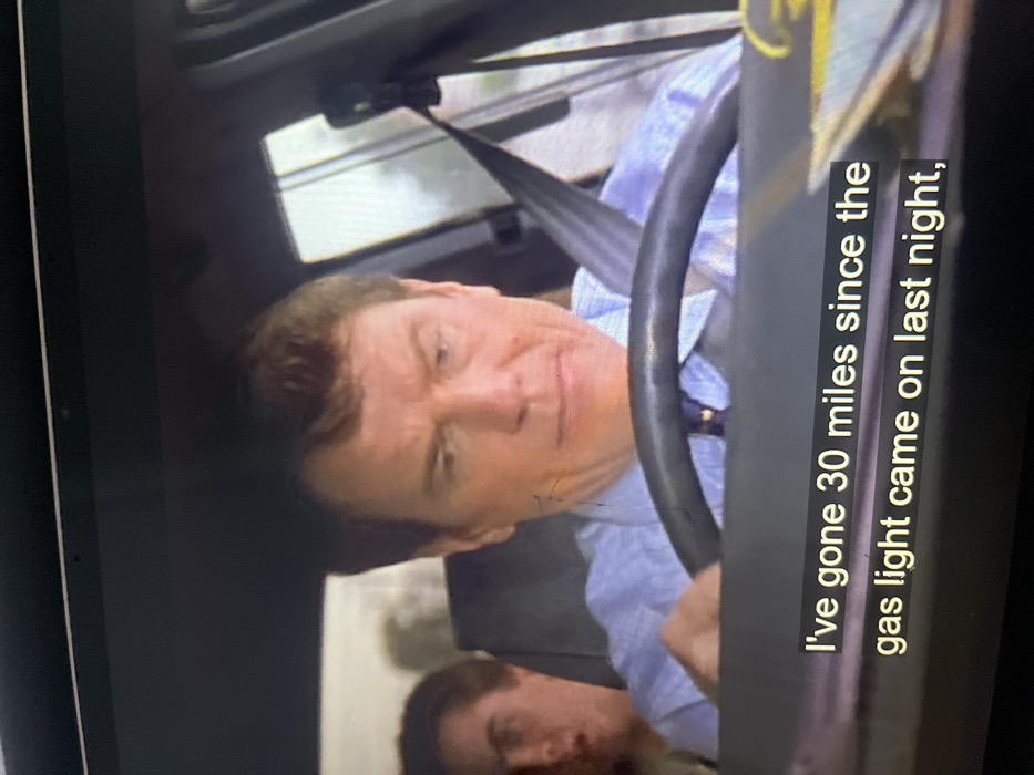 The image displays an interior view of a vehicle, purportedly located in Gosnells, Australia. A middle-aged male, with light brown hair, is seated in the driver's position, gripping a black steering wheel with both hands. He is wearing a light blue collared shirt and a dark tie, with a black seatbelt diagonally across his chest. His facial expression appears serious or strained. Partially visible in the front passenger seat to the driver's left is a younger male, whose mouth is slightly open. The vehicle interior has dark-colored elements, including the dashboard and roof lining. The external environment, visible through the windows, is blurred and appears to be daytime. A text overlay at the bottom of the image reads: "I've gone 30 miles since the gas light came on last night," in white text on a black background.