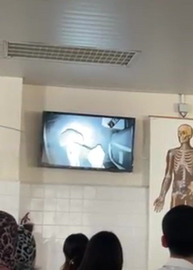 The video depicts a classroom setting with students watching a television screen. The screen displays a black and white image of what appears to be a medical or scientific procedure. Hands are seen manipulating an object under a bright light, possibly in a laboratory or medical environment. The classroom features tiled walls and a skeleton diagram on the wall. The students are facing the screen, indicating they are observing the procedure being shown.