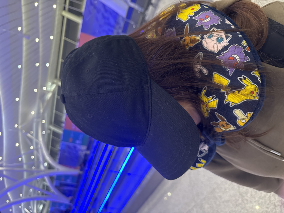An individual is depicted in King Abdulaziz International Airport (KAIA) Terminal 1, Jeddah, Saudi Arabia. The person, viewed from a slightly elevated angle, wears a plain black baseball cap, an olive green hooded sweatshirt, and a dark blue travel neck pillow. The neck pillow is patterned with various colorful Pokémon characters, specifically identifiable as Pikachu, Eevee, Gengar, Jigglypuff, and Psyduck. The individual's face is obscured by the cap's brim. The background consists of a modern airport terminal interior, featuring multiple parallel moving walkways illuminated with distinct blue light along their edges. Overhead, the ceiling structure includes prominent white, arched supports and numerous circular recessed lights. Distant walls or partitions are visible with blue and purple ambient backlighting.