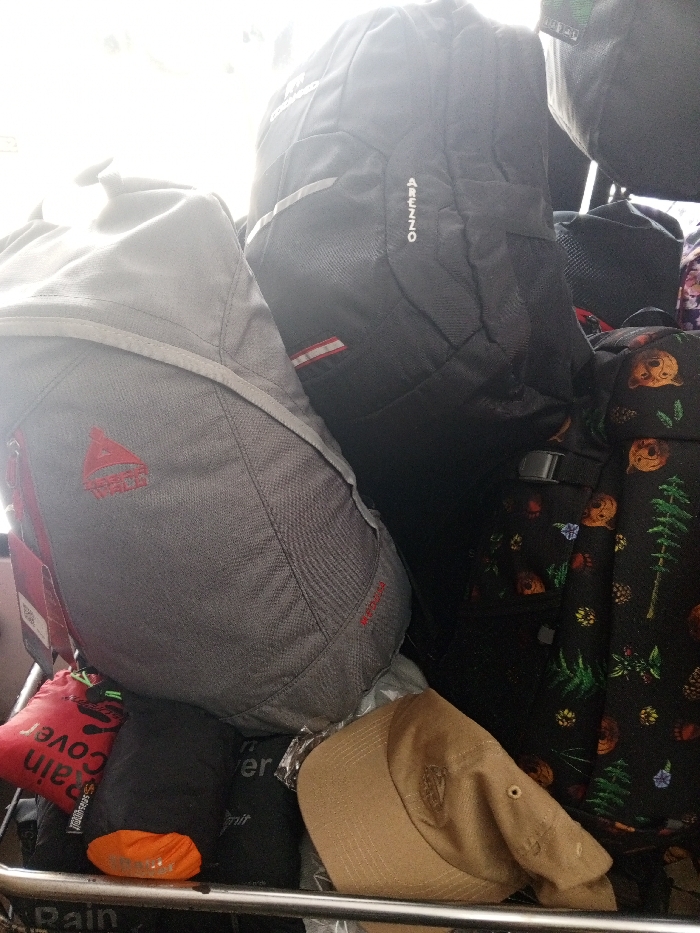 In the city of Baza, Myanmar (Burma), a close-up view depicts a collection of travel luggage stacked together. A grey backpack, featuring a red "TREKKER" logo and an attached product tag, occupies the left side. Behind it, a black backpack with "AREZZO" text vertically aligned on its side, a reflective strip, and a red/white accent is visible. To the right, a dark bag or backpack displays a pattern of cartoonish brown bears, green pine trees, and various colorful flowers; a black buckle is integrated into its design. Resting beneath these bags, on a silver-colored metal rail, are a red pouch labeled "Rain Cover," a dark fabric pouch, and a crumpled tan baseball cap. The background is overexposed with bright white light. No individuals are present in the scene.