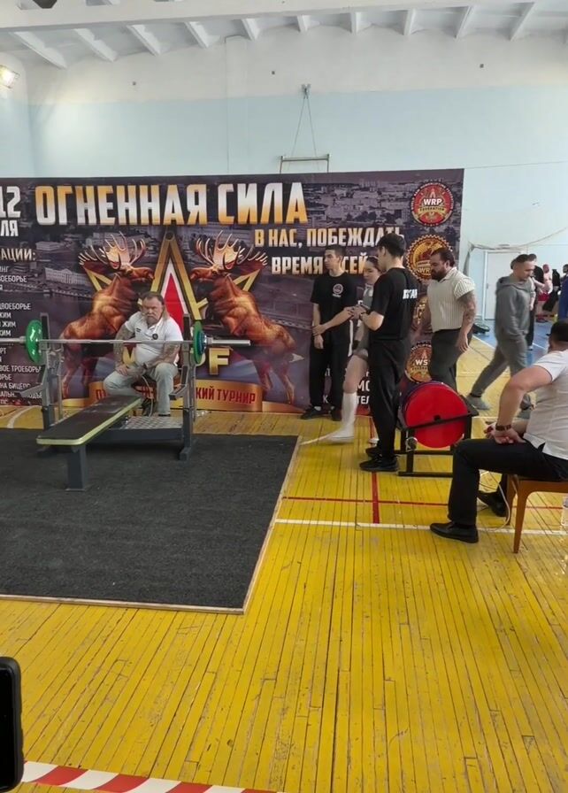 The scene takes place inside a gymnasium-style building with a yellow and red striped wooden floor. A powerlifting competition is underway, as indicated by the "Огненная Сила" (Fiery Power) banner in the background, which includes details about the event dates, nominations, and organizers. A woman in a gray-green athletic outfit and white shoes approaches a weight bench. Two men sit on chairs nearby, seemingly judges or officials. Several other men stand in the vicinity, observing and interacting with each other. A weightlifter is setting up on the bench. The camera's perspective is static, capturing a wide view of the competition area. A smartphone on a tripod is visible in the lower-left corner of the frame, suggesting someone is recording the event. The overall atmosphere seems focused on the powerlifting activity.
