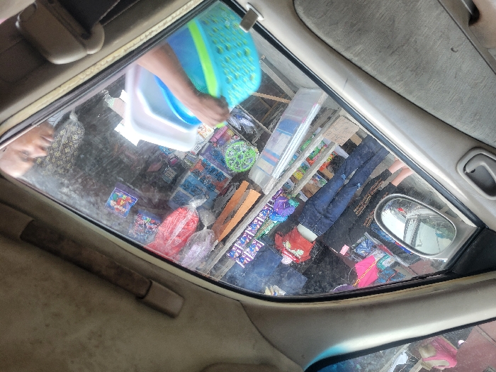 This image, captured in Uyo, Nigeria, shows an outdoor commercial scene viewed through the dirty passenger-side window of a vehicle