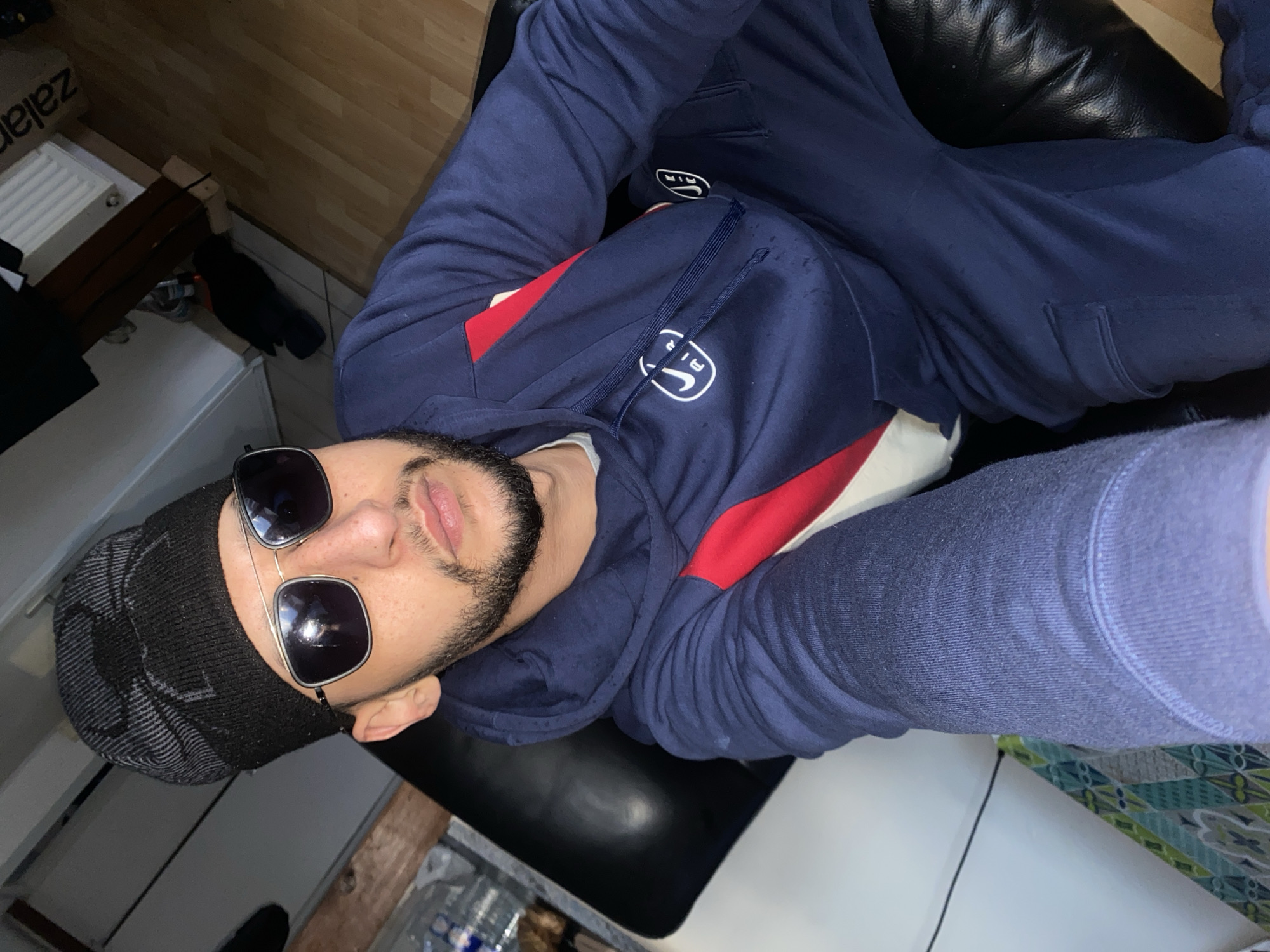 A man is reclining in a black leather chair. He is wearing a dark blue hooded sweatshirt with red and white accents, matching dark blue sweatpants, a black beanie, and sunglasses. The chair is positioned near a wooden floor and a white wall with some patterned fabric. The location is Bischheim, France.