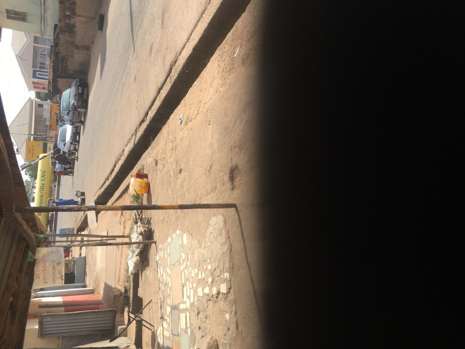 The image depicts a daytime street scene in an unspecified city, Unknown, Unknown, captured from under a shaded overhang. A dark, broad shadow obscures the lower third of the frame. In the immediate foreground, to the left, a portion of a dirt and fragmented tile sidewalk is visible beneath a corrugated metal roof supported by several poles. A foldable chair with a brown seat is positioned on the sidewalk to the far left. A sign with mirrored text, including the word "PASSPORT," is affixed to an adjacent building wall. Further into the midground, on the dirt ground adjacent to the road, two yellow plastic jerry cans and one red plastic container are present. An asphalt road, bordered by a concrete gutter on the near side, extends horizontally across the scene. On the far side of the road, a large yellow tanker truck with "Greenville LNG" emblazoned on its side is parked. Several individuals, approximately five to seven, are gathered near the tanker truck and a white sedan parked behind it, appearing to be engaged in observation or interaction. One person in a blue shirt is visible near the front of the tanker, potentially carrying an object. Two other sedans, a white one and a black one, are parked further along the road on the near side. Beyond the road, a series of multi-story buildings, varying in color and architectural style, are visible under bright sunlight, suggesting a mixed-use urban environment. A low concrete wall runs along the right side of the road.