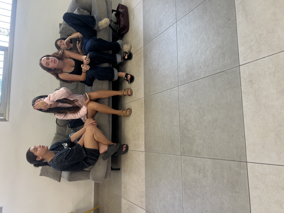 The image depicts an indoor scene with four young females seated on a grey, three-seater sofa. The setting is a generic room with plain white walls and a tiled floor. There is no specific visual information within the image to definitively confirm the city of Tel Aviv, Israel, beyond the user's prompt. From left to right: 1. **Female 1:** Has dark, curly hair tied back. She wears a dark grey oversized t-shirt and dark shorts, with black slide sandals on her feet. Her legs are crossed, and she appears to be speaking or reacting, looking towards the left with her mouth slightly open. 2. **Female 2:** Has long, straight dark hair. She wears a light pink long-sleeved knitted top and dark shorts, with gold-colored flat sandals. She holds a light-colored smartphone in her left hand, resting on her lap. Her right hand is raised, covering her face (eyes and nose) with an open palm. 3. **Female 3:** Has long, wavy reddish-brown hair. She wears a black spaghetti-strap top and dark blue wide-leg jeans with rolled cuffs, along with black chunky sandals. She holds an elongated, light-brown object with both hands in her lap and looks slightly towards Female 2. 4. **Female 4:** Has dark hair, partially obscured. She wears a dark top and dark blue jeans, with cream-colored flat shoes or sandals. She is leaning back against the sofa cushions, with her head tilted to the right and eyes looking upwards. Her right leg is casually extended over her left. She holds a dark smartphone in her left hand, resting on her chest. A dark red or burgundy bag is placed on the floor directly in front of her. The sofa is grey fabric with dark metal legs. Above the sofa, a horizontal window with a dark frame is visible, showing green foliage outside. The floor is composed of large, rectangular tiles in alternating light grey and beige shades, creating a checkerboard pattern. A yellow object, possibly a stool leg, is partially visible on the far left. The lighting is bright and even.