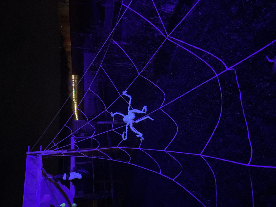 The scene depicts an outdoor nighttime environment in Swyre, United Kingdom, illuminated predominantly by purple/ultraviolet artificial light. A large, manufactured spiderweb, constructed from white rope or cord, occupies the foreground and mid-ground, fluorescing bright purple. A white, multi-legged decorative spider figure, approximately 30-40 cm in length, is suspended centrally within the web, also glowing purple. The left side of the web is anchored to a vertical wooden post, which is part of a larger wooden framework. Above this framework, a white canopy or tarp is visible, also fluorescing purple. Hanging from the canopy or framework are two additional decorative objects: one white, resembling a sock or boot, and another darker, elongated item. The immediate ground consists of dark vegetation or grass, rendered in dark purplish tones. In the distant background, a horizontal line of multiple, small, artificial lights (white, yellow, and green) is visible. No individuals or specific actions are present. The exact location within Swyre is indeterminate from the provided image.
