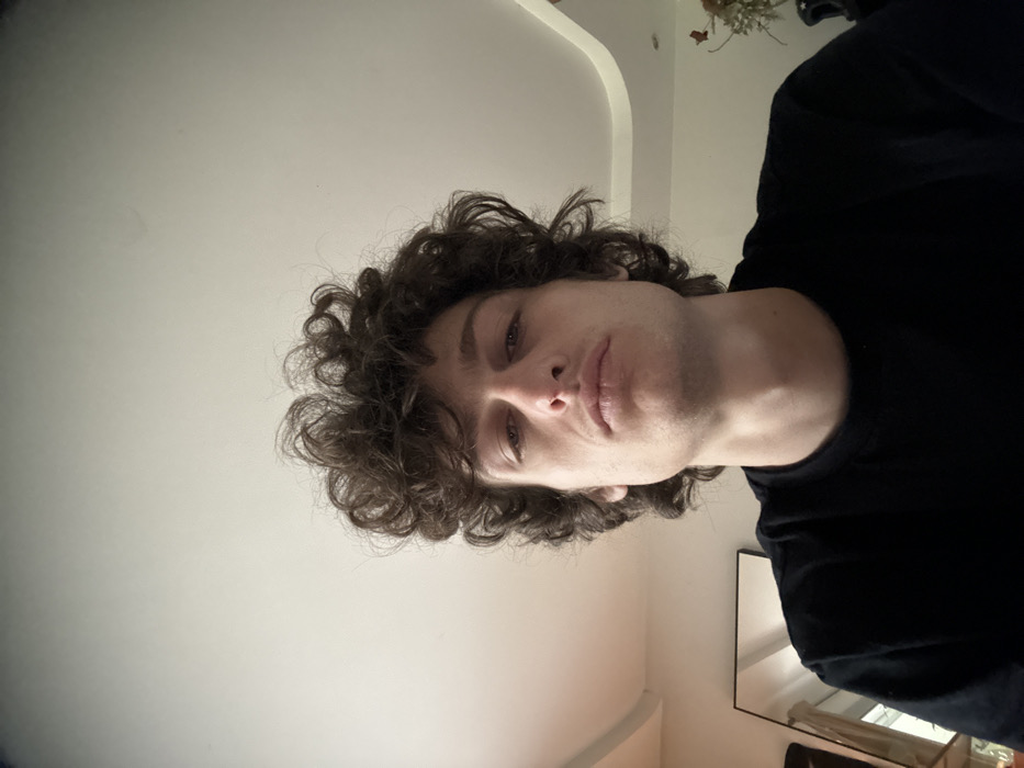 A close-up, low-angle shot features an adult male subject positioned centrally, gazing upwards towards the camera. The subject has dark brown, voluminous, curly hair that appears disheveled, and light-colored eyes. He wears a black, short-sleeved crew-neck t-shirt. Slight stubble is visible on his chin and jawline. The background consists primarily of a plain, light-colored ceiling, which occupies the upper two-thirds of the frame. Architectural details, including a subtle curved design, are visible on the ceiling's right side. To the lower left of the subject, a portion of a dark-framed object, possibly a mirror or picture, is visible. To the lower right, an indistinct decorative object, potentially a dried floral arrangement, is partially visible. The scene is illuminated by an unseen overhead light source. The specific location within Vincennes, France, is not discernible from the provided visual evidence, which depicts an indoor setting.