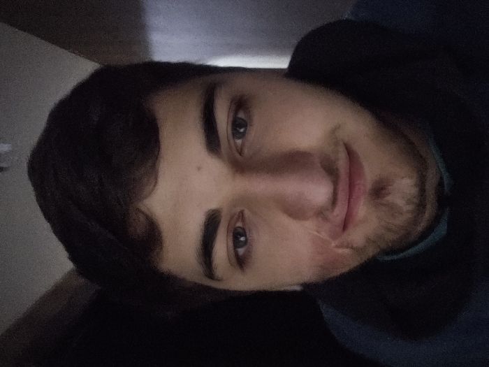 **Location:** An indoor setting within the city of Unknown, Unknown. A young adult male subject is depicted in a headshot-style photograph. He has dark brown hair, dark eyebrows, and blue eyes. A prominent reddish, slightly raised scar is visible on the left side of his face, extending from below the left eye towards the cheek and upper lip. He has patchy stubble on his chin and jawline. The subject exhibits a faint, closed-mouth smile or smirk and is looking directly at the camera. He is wearing a dark-colored hooded garment over a teal or light blue shirt, with the collar of the hooded garment partially obscuring the lower face. The background is dark and out of focus, with a vertical lighter strip visible on the right side, suggesting an indistinct wall or doorway in a low-light environment. Illumination is uneven, with slightly more light on the right side of the subject's face.