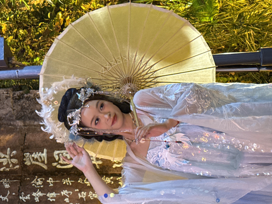 - "A young East Asian female subject is depicted in a medium close-up, posing outdoors, likely at night, in an illuminated cultural setting" by FM-LQg7b2, licensed under CC BY 4.0