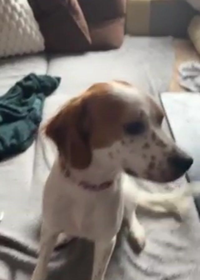 medium-sized dog sitting on a couch. The dog is mostly white with brown ears and brown spots. It has a pink collar. A hand is briefly visible as it makes a snapping noise. The dog reacts with a bark. The couch has grey and brown cushions and a green blanket.