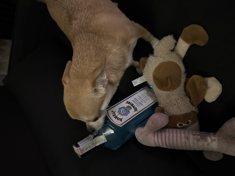 - "A small, tan-furred canine is positioned with its head near the neck of a blue glass bottle of Bombay Sapphire London Dry Gin" by FM-gglak2, licensed under CC BY 4.0
