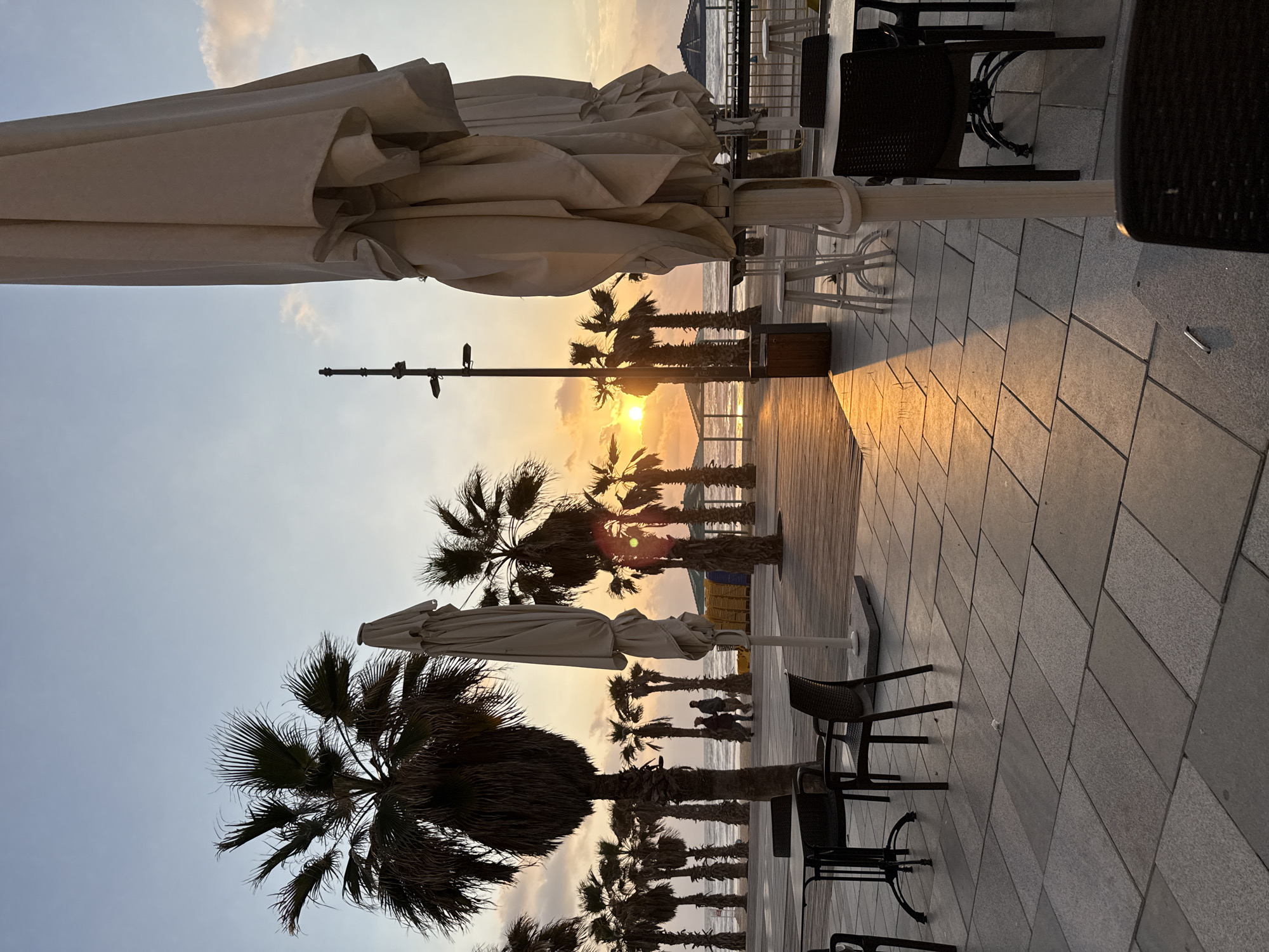 The scene depicts a coastal promenade in Bat Yam, Israel, at sunrise or sunset, characterized by strong golden light from the low sun positioned over the Mediterranean Sea. In the foreground, a tiled paved area features several unoccupied outdoor cafe tables with dark chairs. Two large, closed, light-colored fabric umbrellas on stands are prominent, one positioned centrally to the right, and another partially visible to the left. A dark light pole with multiple fixtures stands centrally, adjacent to a brown trash bin. Parallel to the paved area, a wooden boardwalk extends towards the beach. A continuous line of palm trees with dark, silhouetted fronds and visible trunks separates the boardwalk from the sandy beach. Three individuals are observed walking on the sandy beach near the water's edge, their figures silhouetted against the bright horizon. Further along the beach, stacked yellow beach chairs and dark, conical beach shade structures are visible. A metal railing delineates the edge of the promenade before the beach. The sky exhibits a gradient from light blue overhead to warm orange and yellow tones near the horizon, with the sun appearing as a bright, circular disk between palm trees. The sea is visible with small waves, reflecting the golden light.
