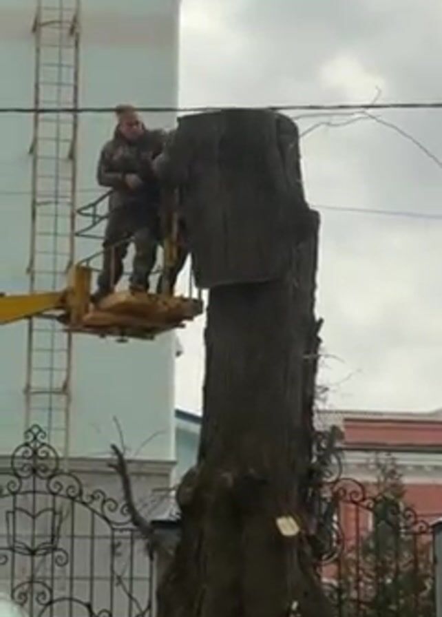 A worker in an elevated lift uses a chainsaw to cut off a large section of a tree trunk
