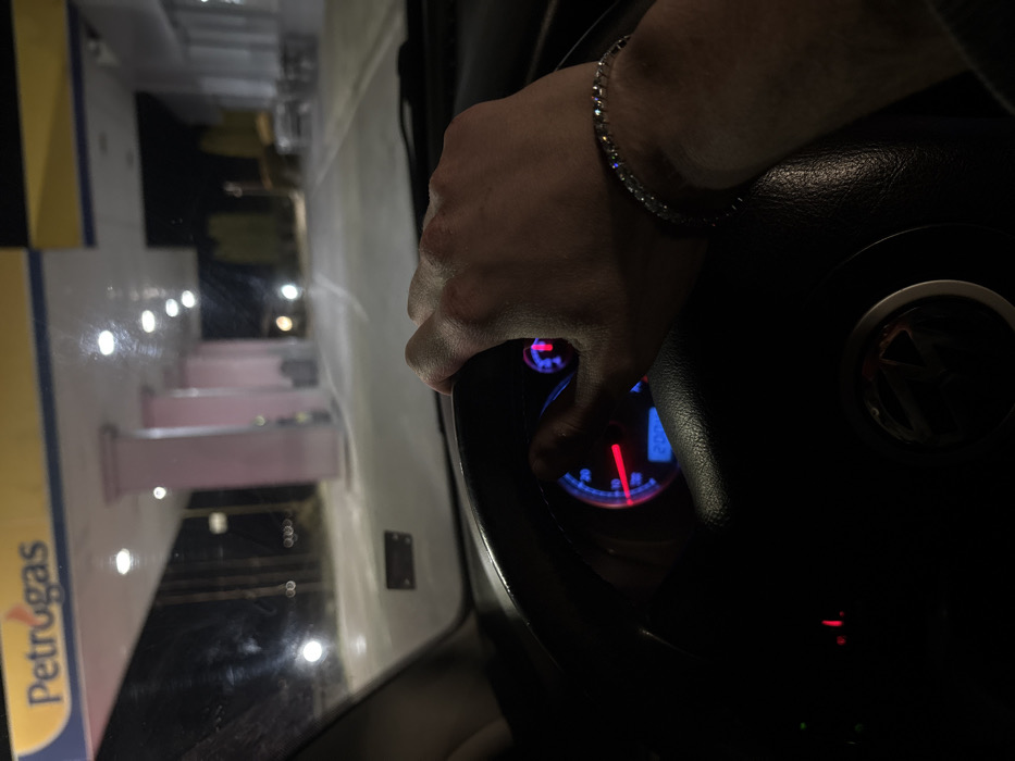 The image presents a nighttime view from the interior of a vehicle, parked or stopped at a Petrogas fuel station in Strumyani, Bulgaria. The driver's right hand, wearing a silver-toned bracelet with multiple clear, reflective stones, is positioned on the dark steering wheel, which bears a partially visible emblem resembling Volkswagen. Behind the steering wheel, an illuminated instrument cluster displays a speedometer with a red needle at a low reading and a blue digital display. Through the windshield, the brightly lit Petrogas canopy, distinguished by its yellow and blue signage, extends overhead. Below the canopy, several light pink support columns are visible, along with fuel pump islands and reflective ground surfaces. The area is illuminated by numerous circular white lights embedded in the canopy. In the midground to the right, a white building with an outdoor seating area is present. Distant blurred vehicle headlights and other ambient lights are visible against the dark background.