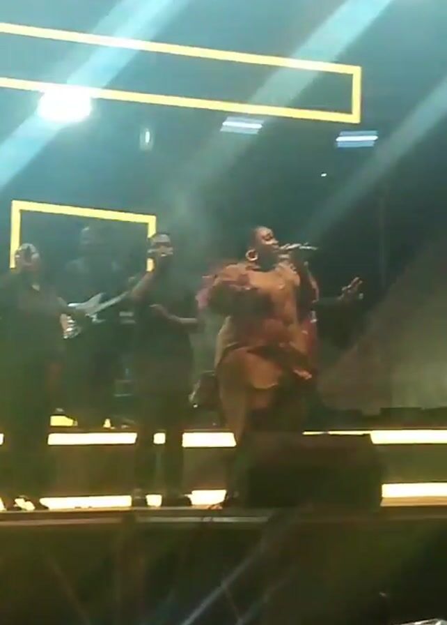 Three singers are performing on a stage illuminated with brightly colored neon lights. A band is playing in the background. The lead singer, on the right, is wearing a brown outfit and singing with enthusiasm. The other two singers are standing on either side of him, also singing. The stage has a modern design with a metallic base. The lights change color frequently, alternating between pink, blue, red, and yellow. A spotlight shines on the performers.
