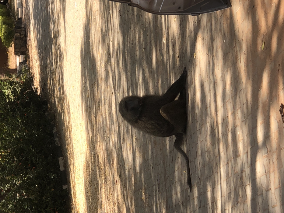 - "A baboon, presumed to be of the olive or savanna species due to its dark fur and robust build, is observed sitting on a paved surface composed of interlocking bricks or pavers" by FM-iGFmW2, licensed under CC BY 4.0