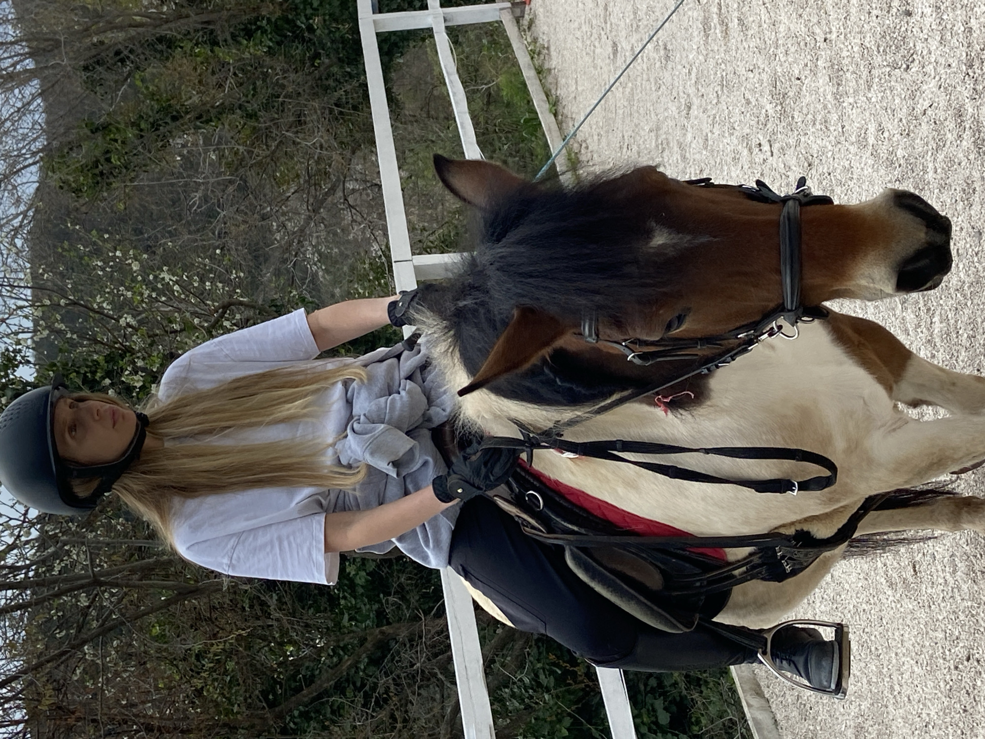 - "A woman wearing a riding helmet and a light gray shirt is sitting on a brown and white horse with a saddle and bridle" by FM-rv1Bv1, licensed under CC BY 4.0